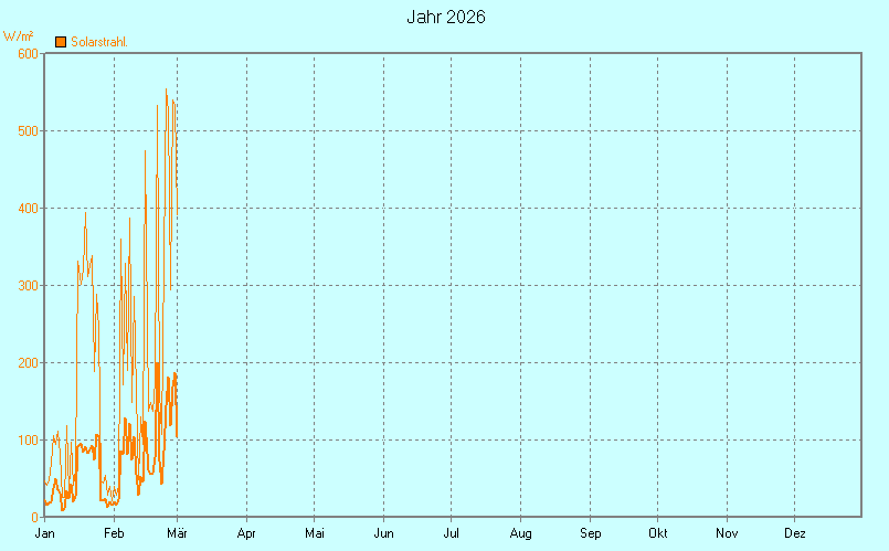 (Globalstrahlung) in W/m² und somit die Sonnenscheindauer erfasst. Von